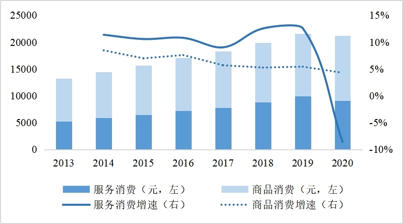 上图总结了2013年到2020年我国居民商品消费与服务消费支出的比重情况。可以看出,服务消费快速增长,成为消费结构升级主要方向,突出表现在服务消费占比不断提高上。2013-2020年我国居民人均服务消费支出年均增速超过8%,明显快于商品消费支出增速。